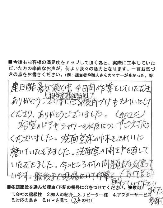 『連日猛暑が続く中作業をしていただきありがとうございました。洗面室の開き戸の調整・床の巾木も磨いてもらい、後片付けもしてもらいありがとうございます。問題なく使用しております。』との事でした。