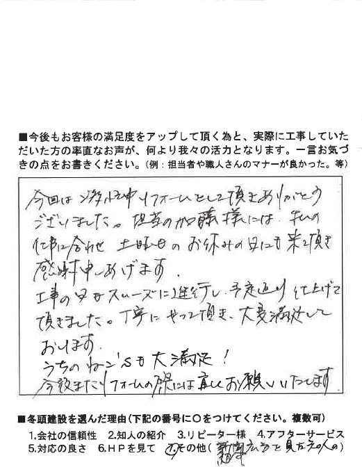 『工事の日程も仕事の都合に合わせていただきスムーズに工事かでき予定通り仕上げてもらいました。うちのねこ’sも大満足!今後またリフォームの際には宜しくお願いいたします。』との事でした。