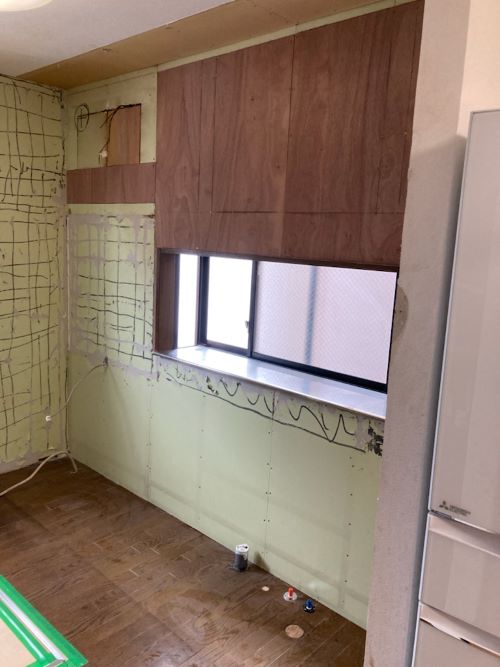 解体後に吊戸棚やレンジフード用の下地を作り、配管・電気・ダクト工事などを施します。