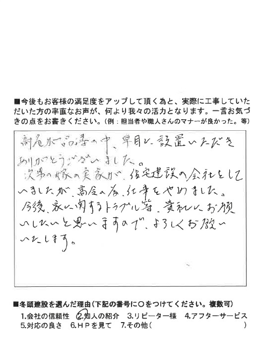 『商品が品薄のなか早めに設置していただきありがとう。今後、家に関するトラブル等、貴社にお願いしたいと思います。』との事でした。