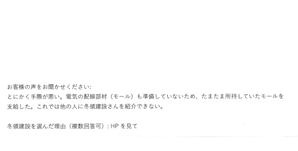 この度は、工事のご依頼をいただきましてありがとうございます。マドショップで検索していただき弊社まで工事のご相談に足を運んでいただきましたこと、大変ありがとうございました。職人がシャッターの調整に手こずってしまいお客様にも大変ご迷惑をお掛けしてしまったようで、申し訳ございませんでした。配線部材はお客様がお仕事柄お持ちになられているものを親切にご提供してくださいましたので、念のため安全を考慮して使用させていただきました。お気遣いいただきましてありがとうございました。今回のことは、今後の課題とさせていただき改善するよう心掛けてまいります。ご指摘ありがとうございました。