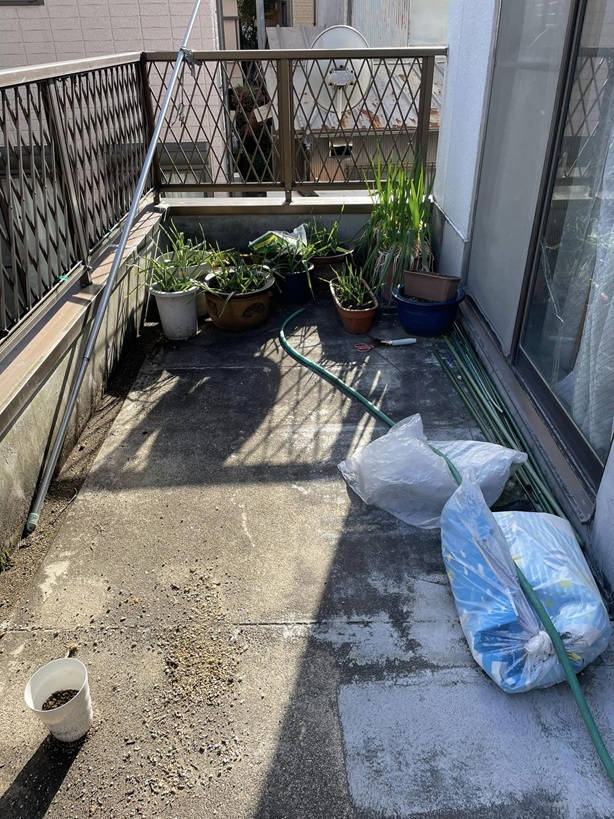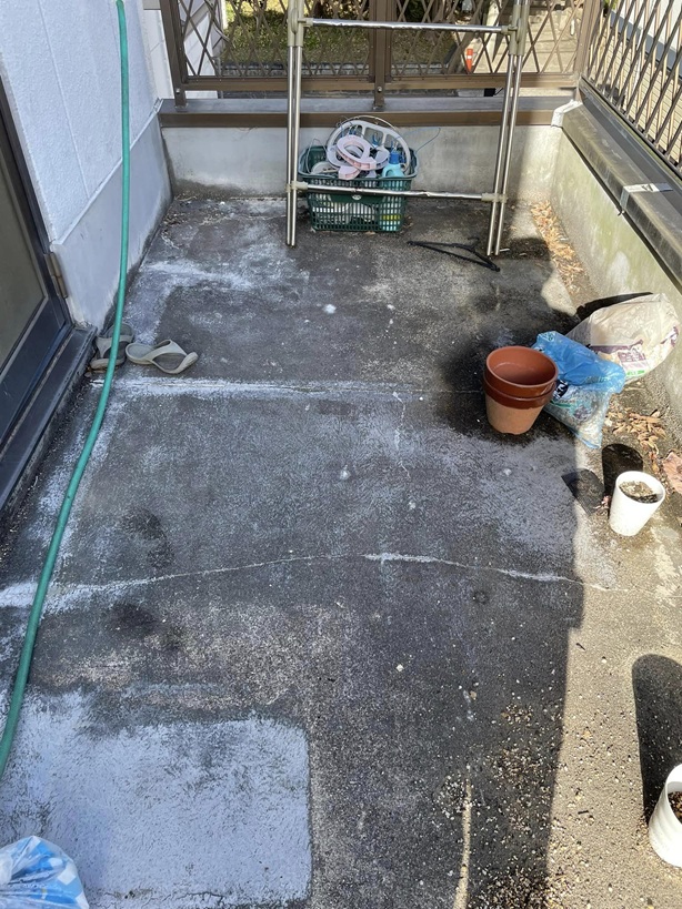 植木鉢を片付けると、上や右側のトップコートは完全に剥がれています。所々にクラック(ひび割れ)も確認できます。この機会に、下地をしっかり補修し防水工事をします。