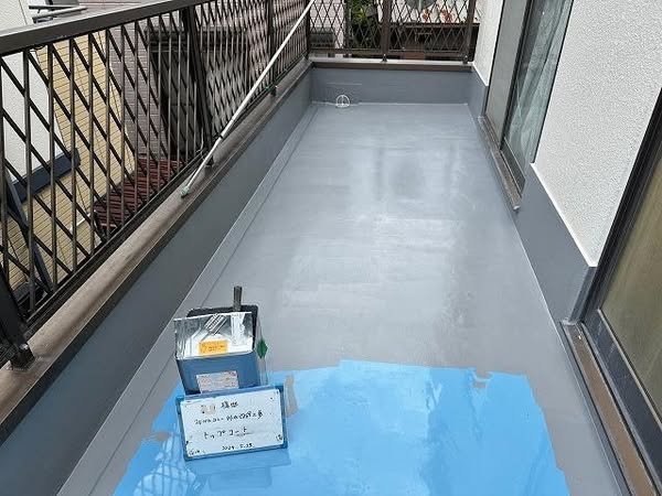 紫外線や雨などによる経年劣化でトップコートは剥げてきますが、ウレタン塗膜まで切れていなければ防水性能に問題はありません。この先は、適度にトップコートの塗り替えをすることで、費用をあまりかけずにバルコニーの防水を維持することができます。