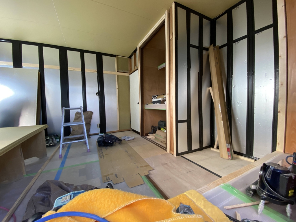 壁・天井もしっかりと断熱しました。隙間風を抑えるために気密テープも施工します。