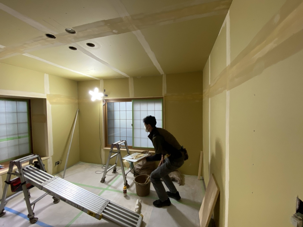大工工事に続きクロス工事です。しっかりと下地処理をした後にクロスを貼っていきます。