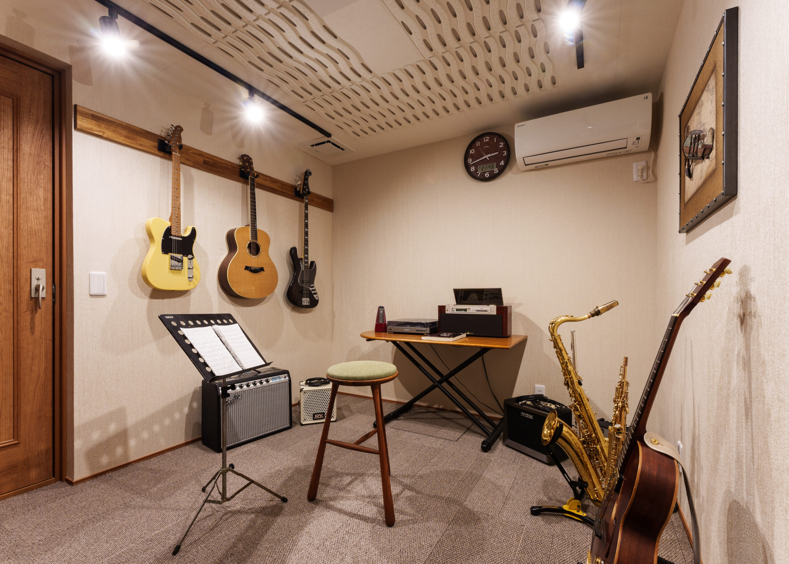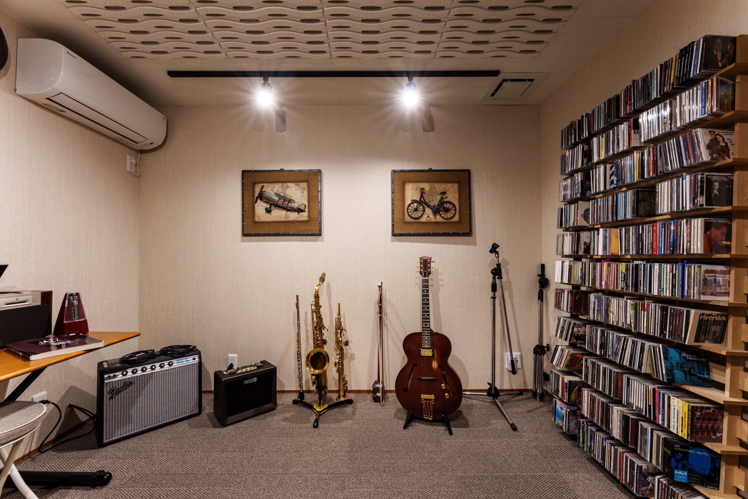 空いている子ども部屋をご主人様が趣味部屋として使用。近隣への音漏れが気になり大きな音で演奏できないことがお悩みで、増える楽器や機材の置き場所にお困り。