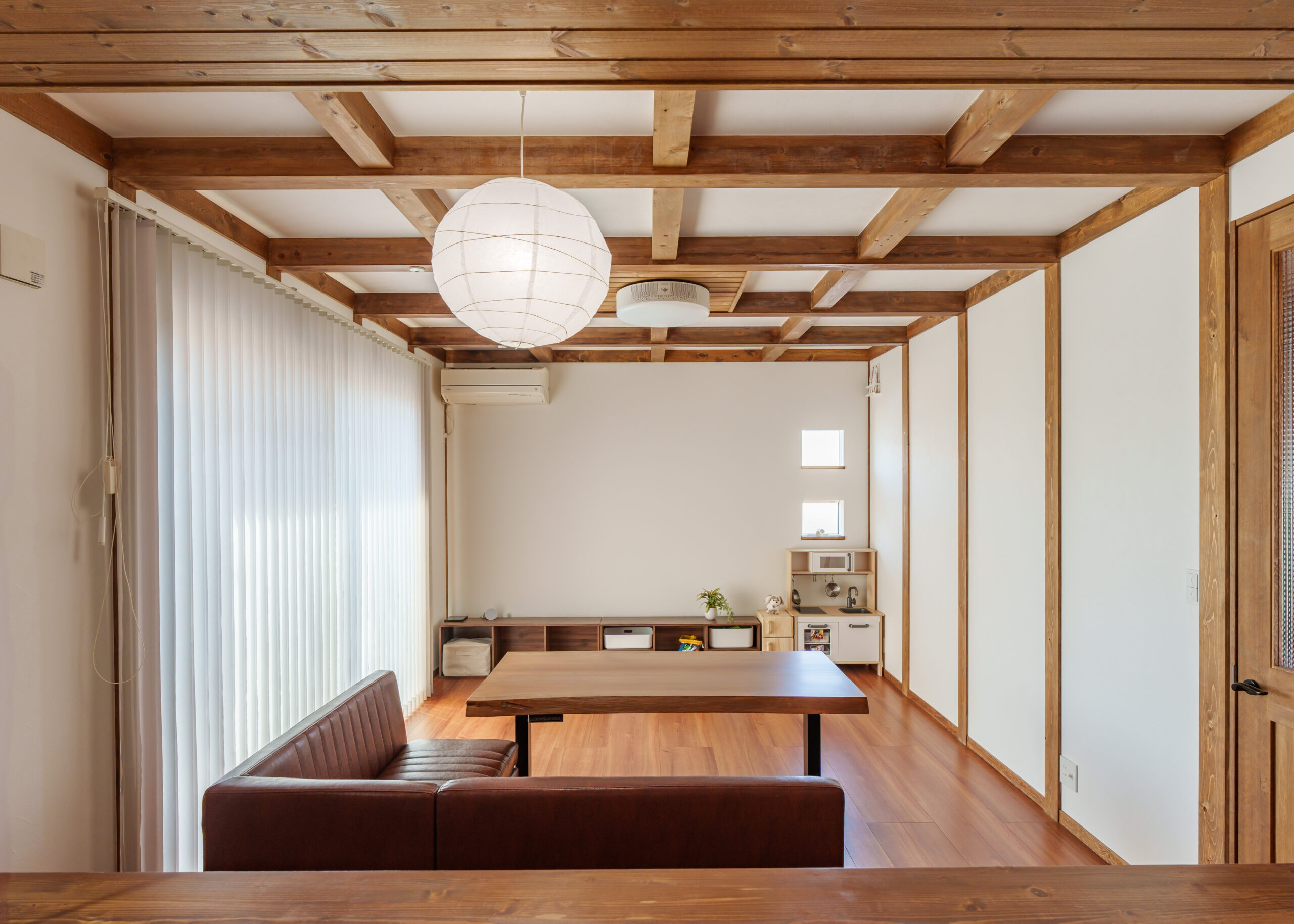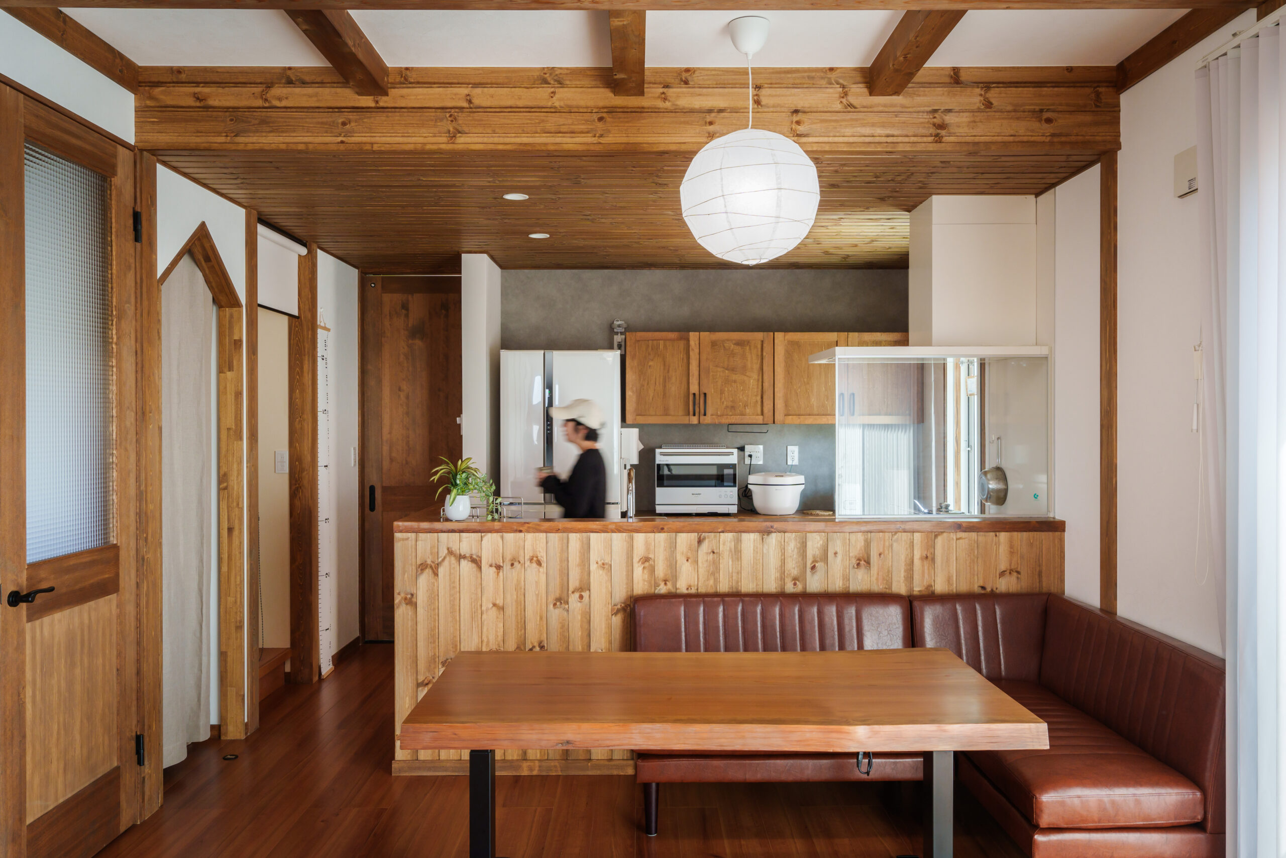 天井に造作梁や羽目板張り、壁には付柱を追加し木の印象を強くしました。建具も無垢建具に交換しています。
