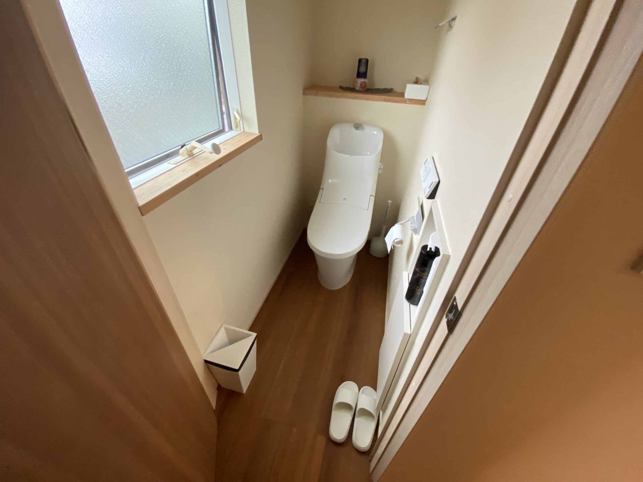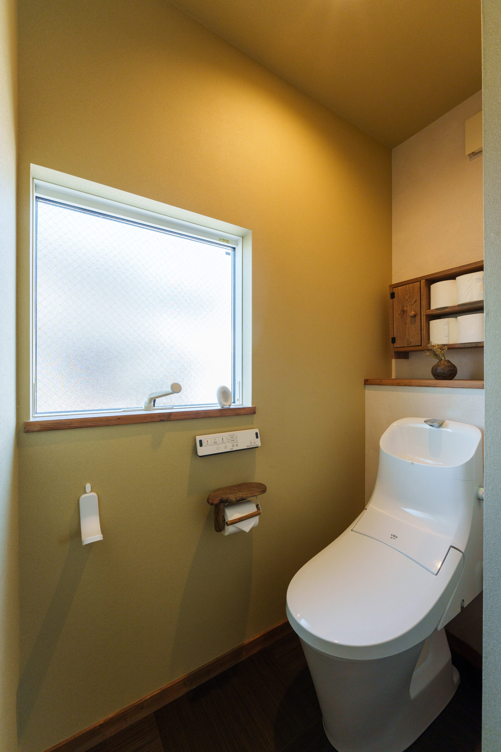 トイレにも奥様が選んだ収納棚とペーパーホルダーを取付。