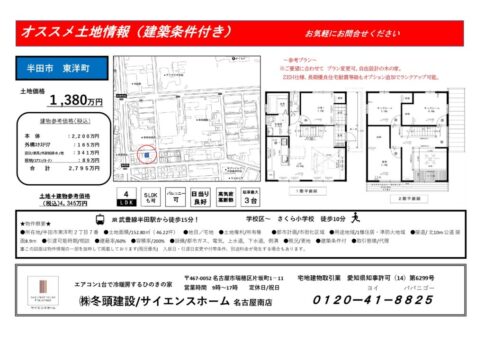 お知らせ詳細はお問い合わせください 【☎ 0120-41-8825】 ●土地価格/1,380万円●所在地/愛知県半田市東洋町2丁目7番 → 地図●土地面積/152.80㎡(46.22坪) ●交通/JR武豊線「半田」駅徒歩15分...