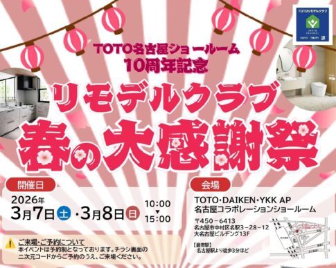 お知らせTOTO名古屋ショールームの10周年を記念した、『 リモデルクラブ 春の大感謝祭』の開催が決まりました!キッチン・お風呂・洗面化粧台などのリフォームをご検討中のお客様。この機会に、実際に見て・触れて・比べてみませんか。シ...