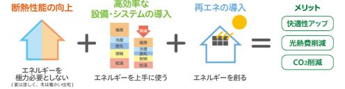 断熱性能を上げて熱の出入りを少なくし、省エネ性能の高い設備を導入して消費エネルギーを抑え、太陽光発電で電気を創る、これらのことを組み合わせ、年間を通して使用電気量をゼロ円とする住宅のことです。