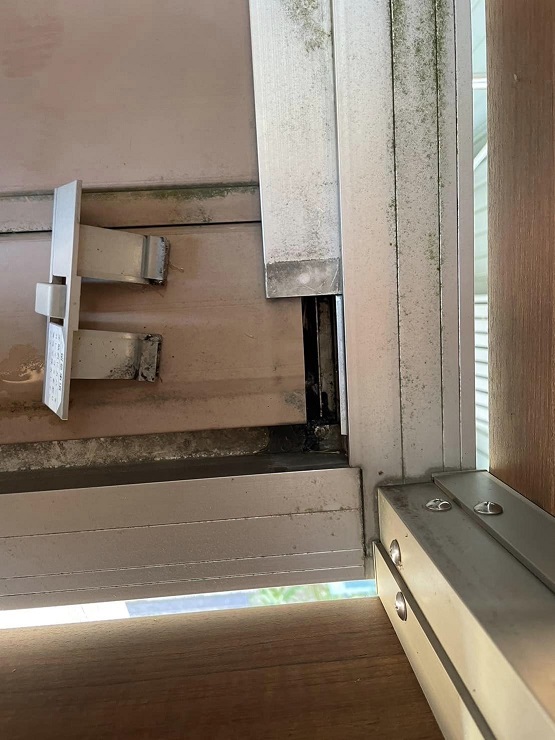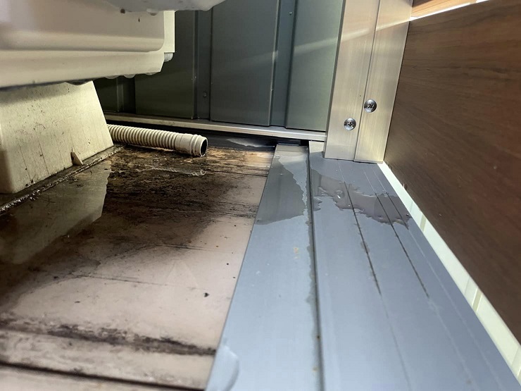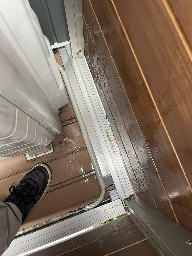 写真でもわかるようにエアコンから排出された水がデッキに溜まっています。この水が、アルミ部材のあたりから漏れているようです。