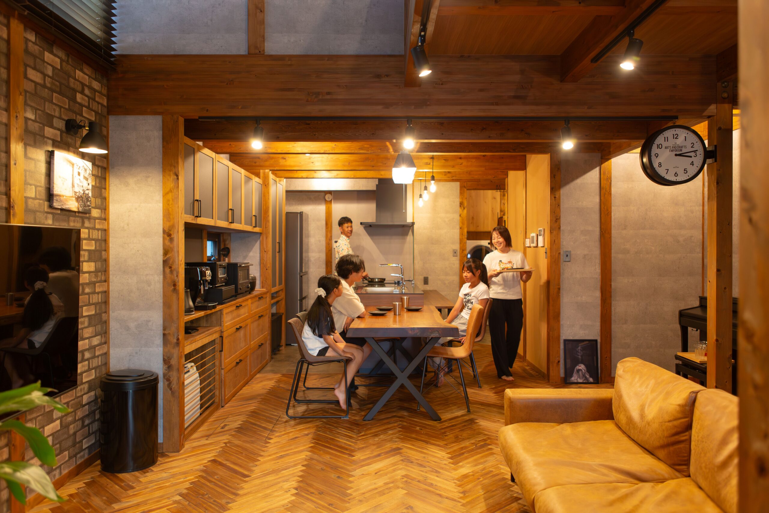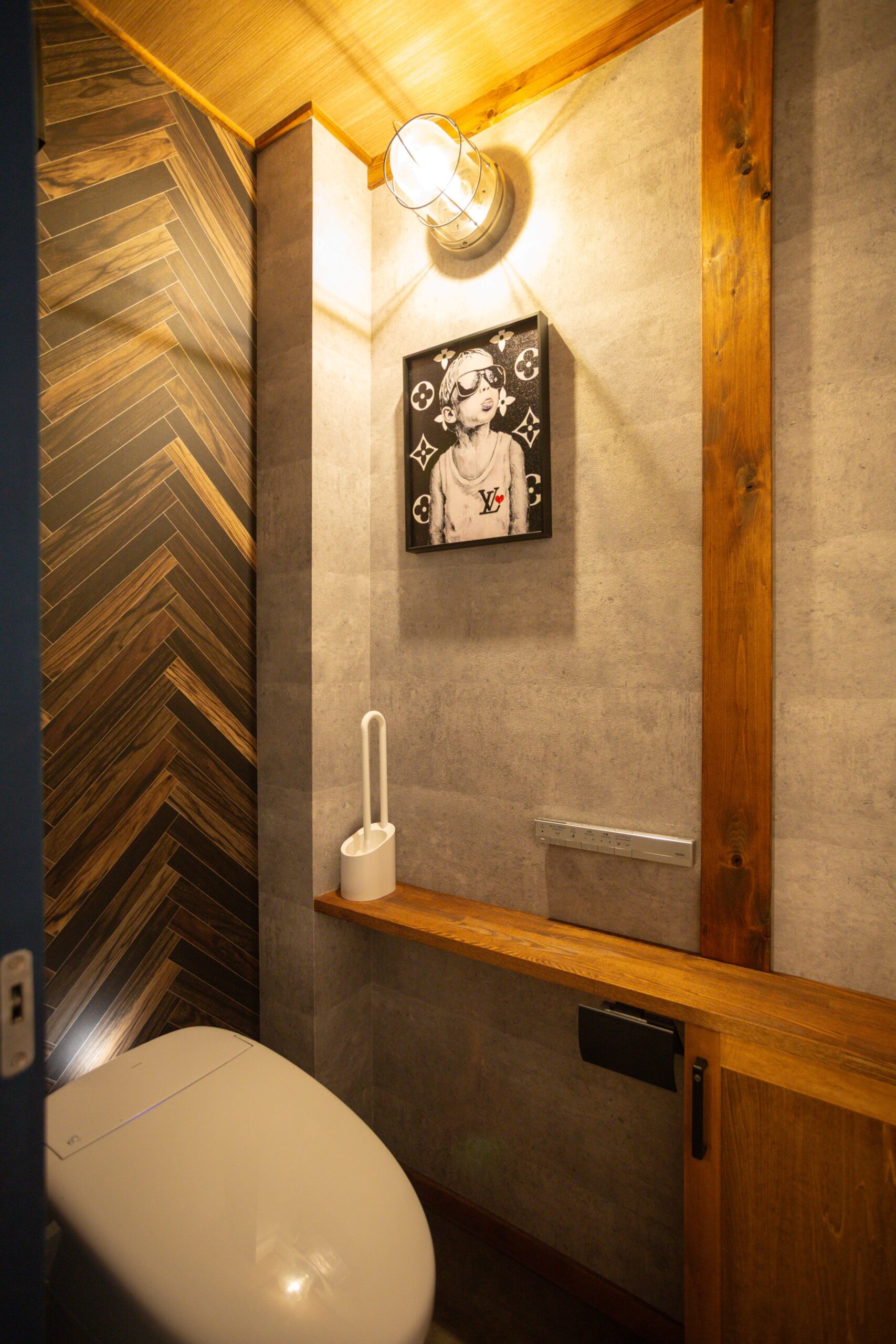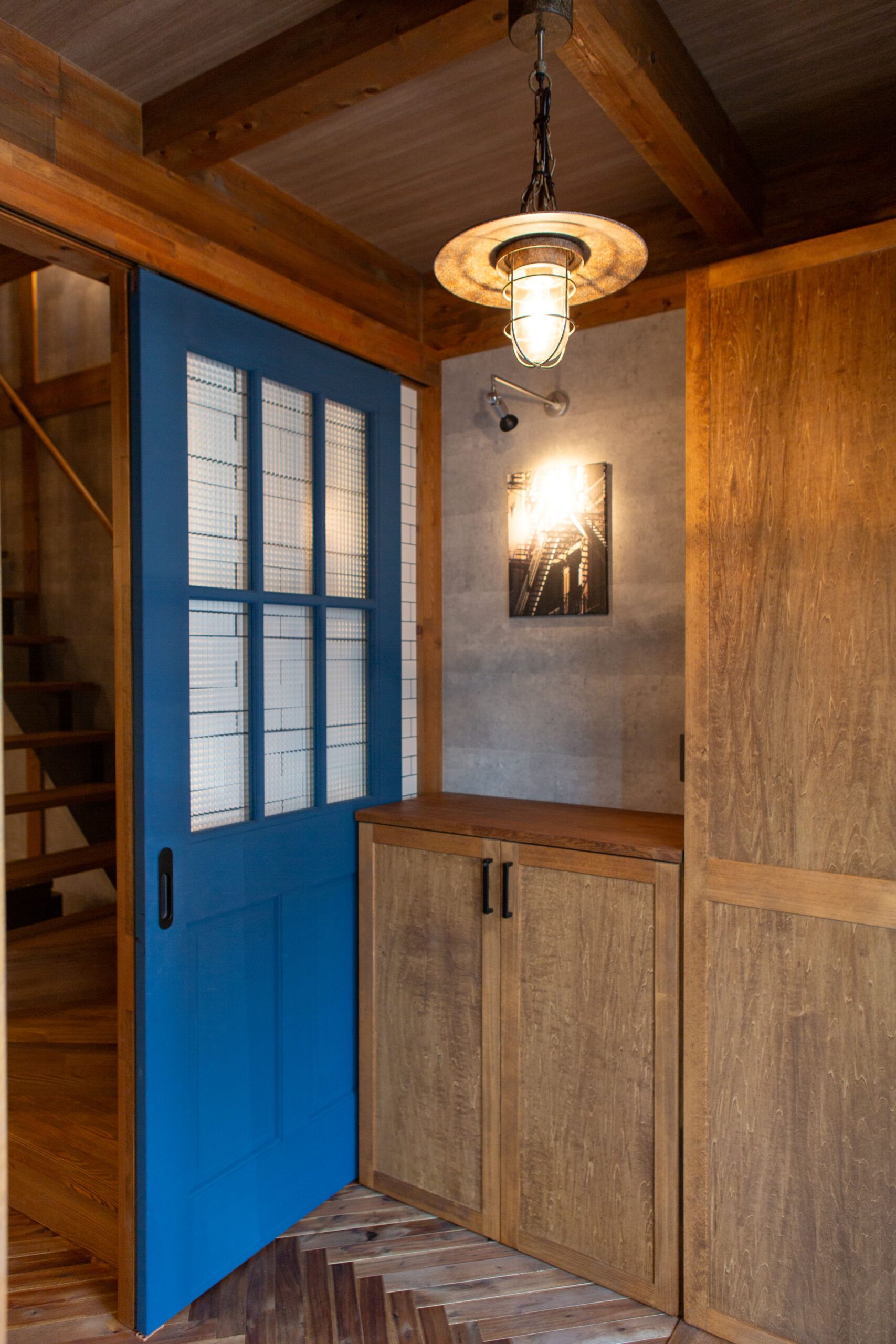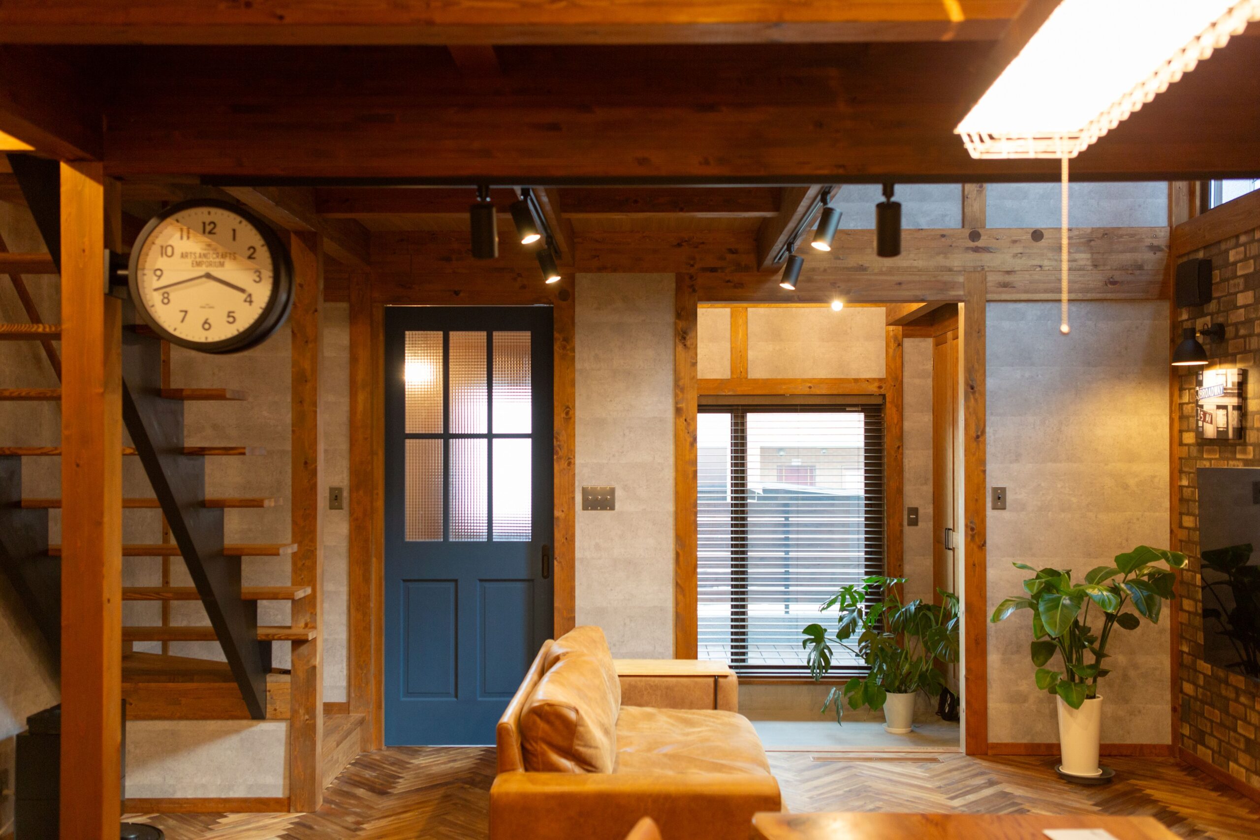 グレーを基調としたスタイリッシュな外観。玄関の扉を開けるとネイビーのガラスドアとヘリンボーンの床をポイントとしたダークでカッコイイ『ブルックリンスタイル』の空間が広がります。スタイルに統一感をもたせるよう、造作家具や電気のスイッチなど細部までこだわっています!
