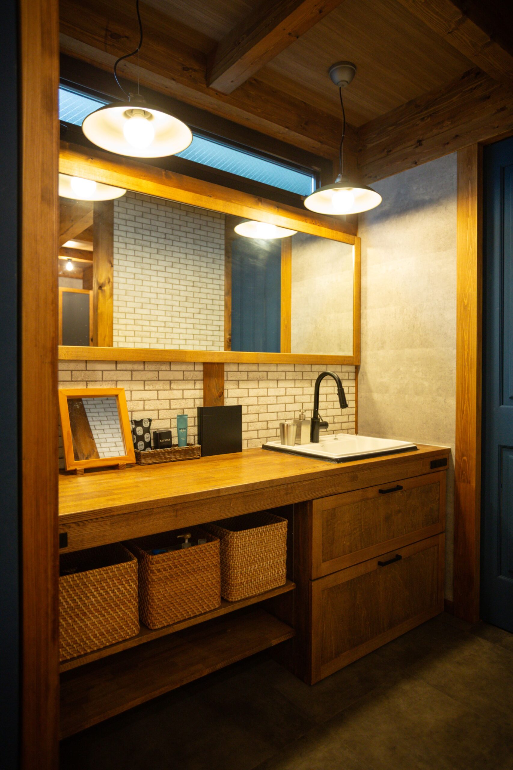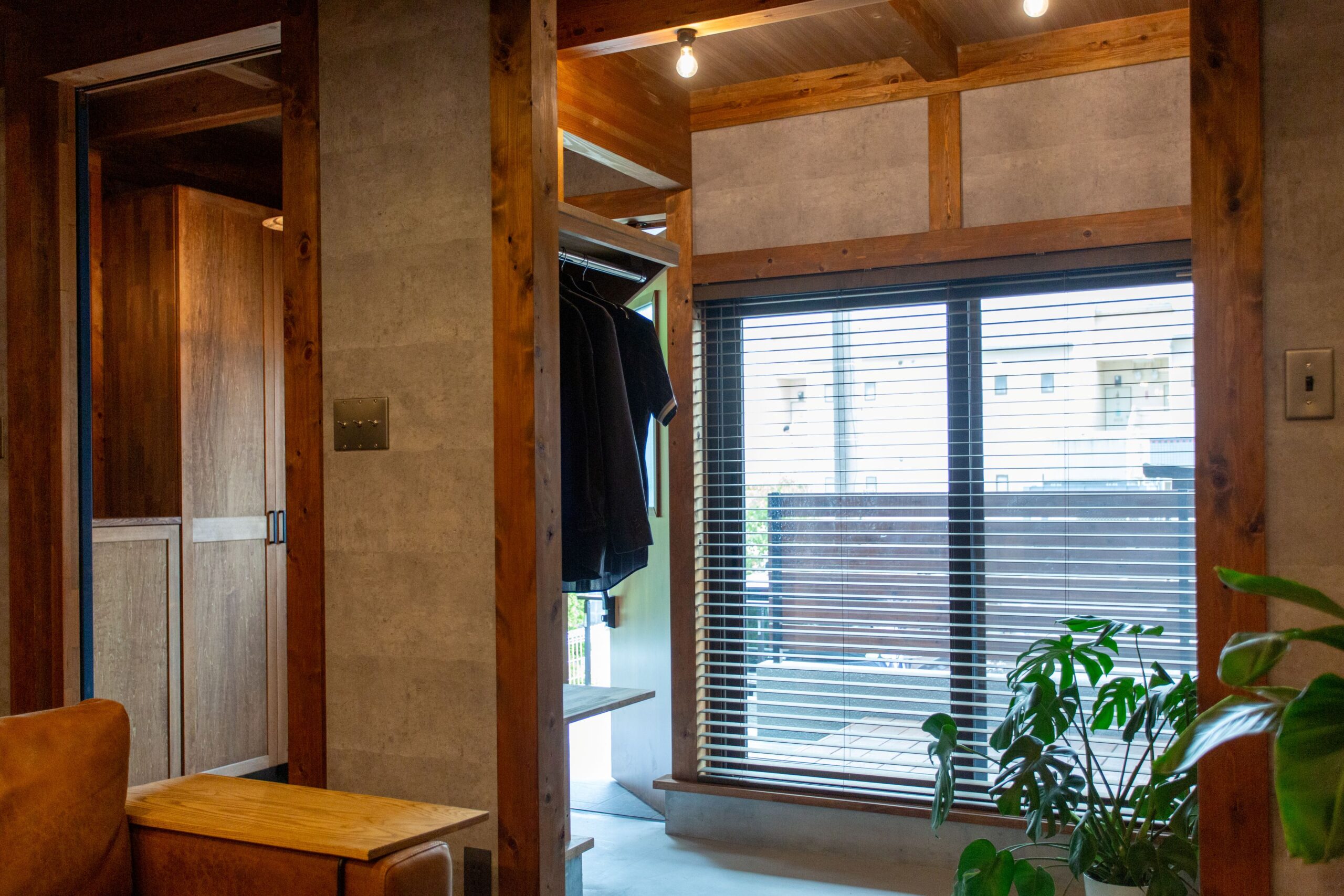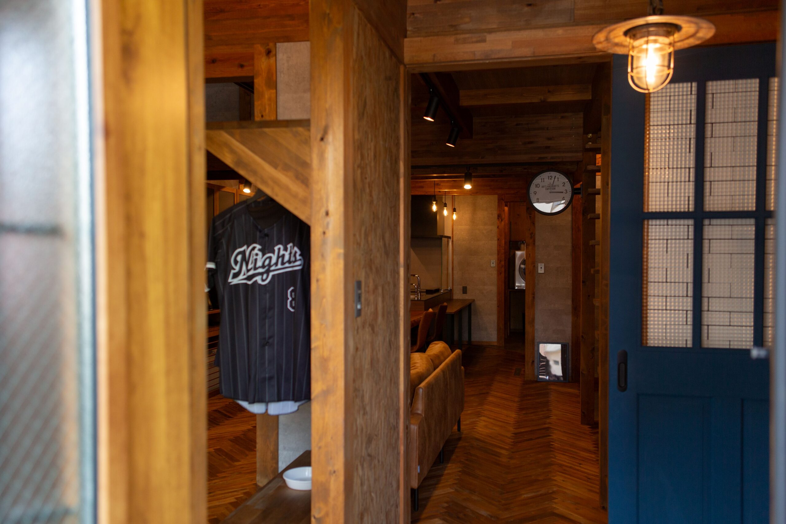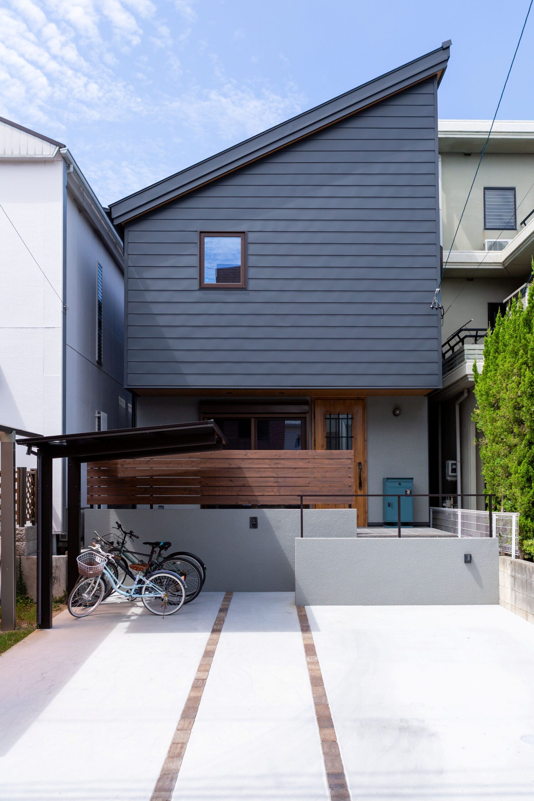 グレーを基調としたスタイリッシュな外観。玄関の扉を開けるとネイビーのガラスドアとヘリンボーンの床をポイントとしたダークでカッコイイ『ブルックリンスタイル』の空間が広がります。スタイルに統一感をもたせるよう、造作家具や電気のスイッチなど細部までこだわっています!