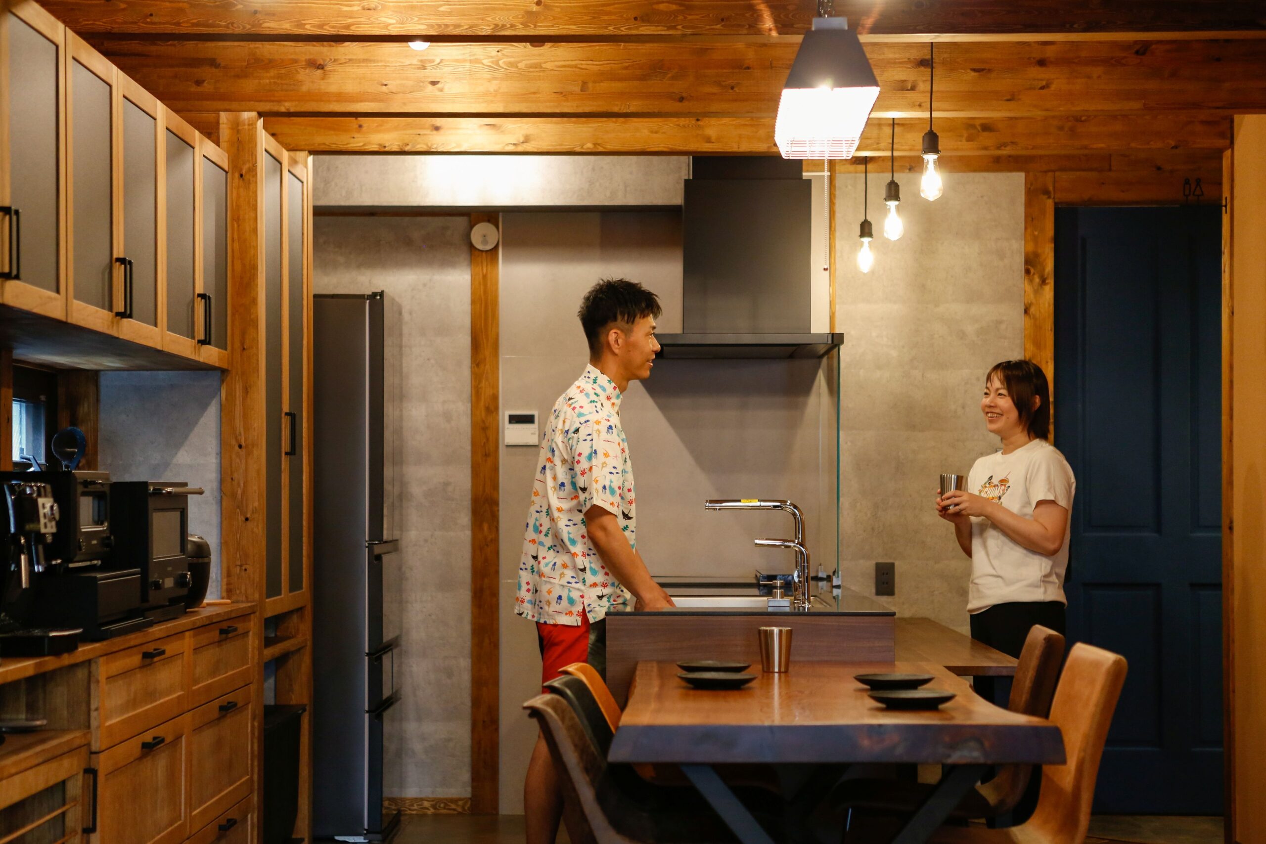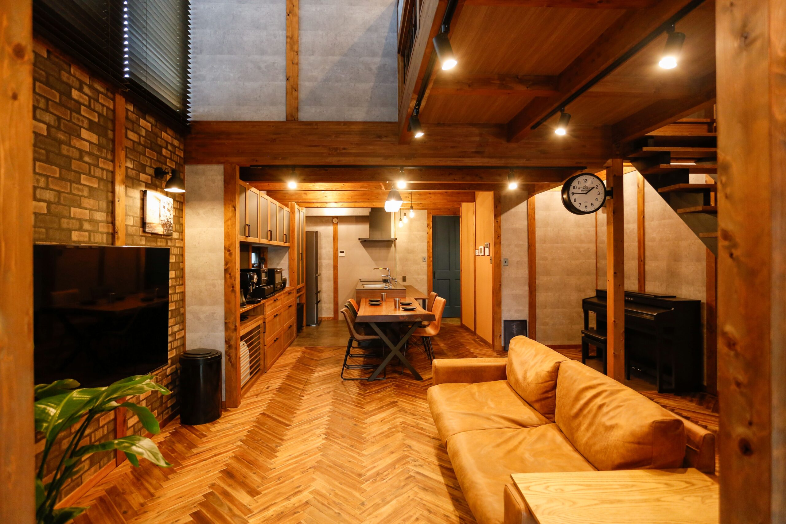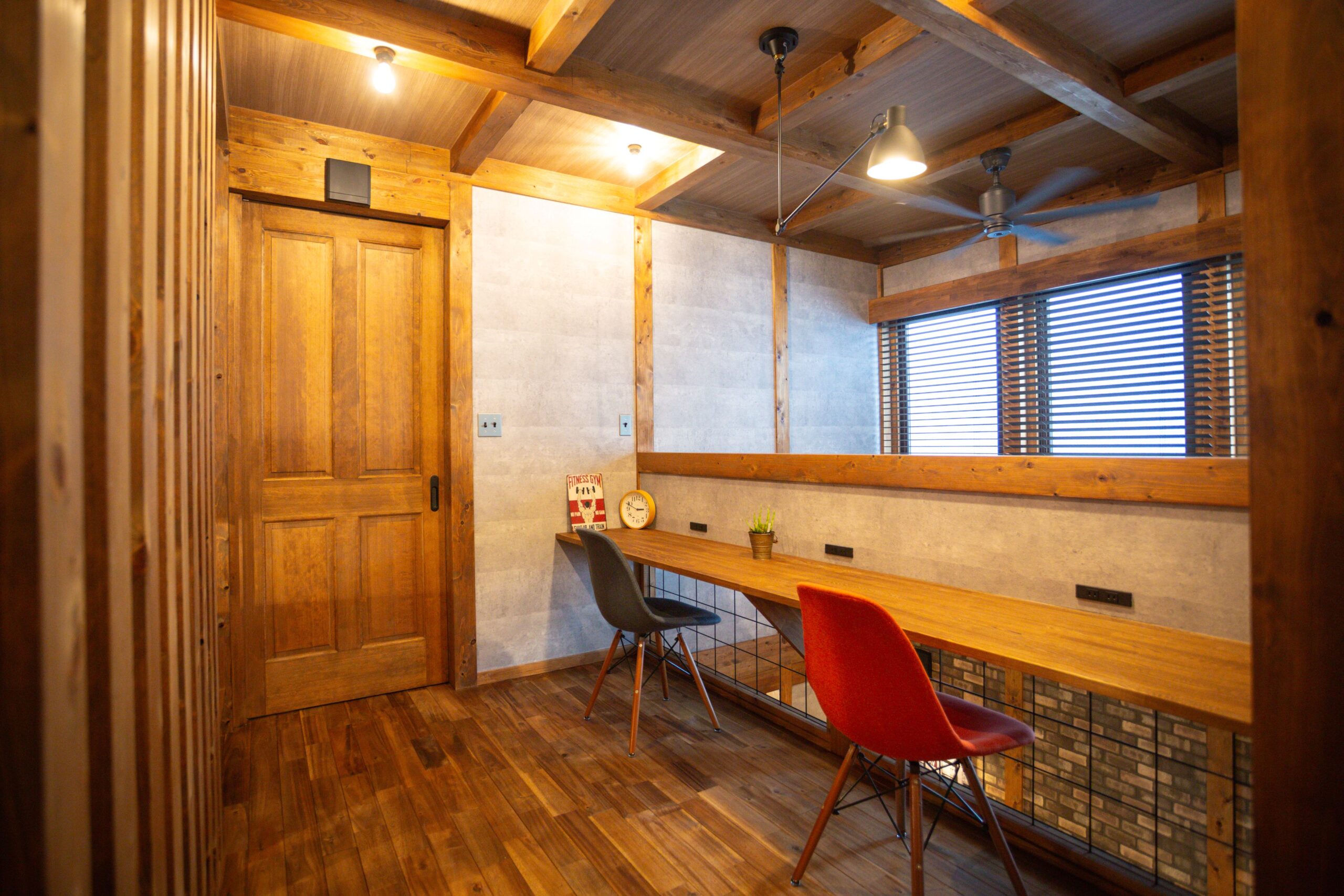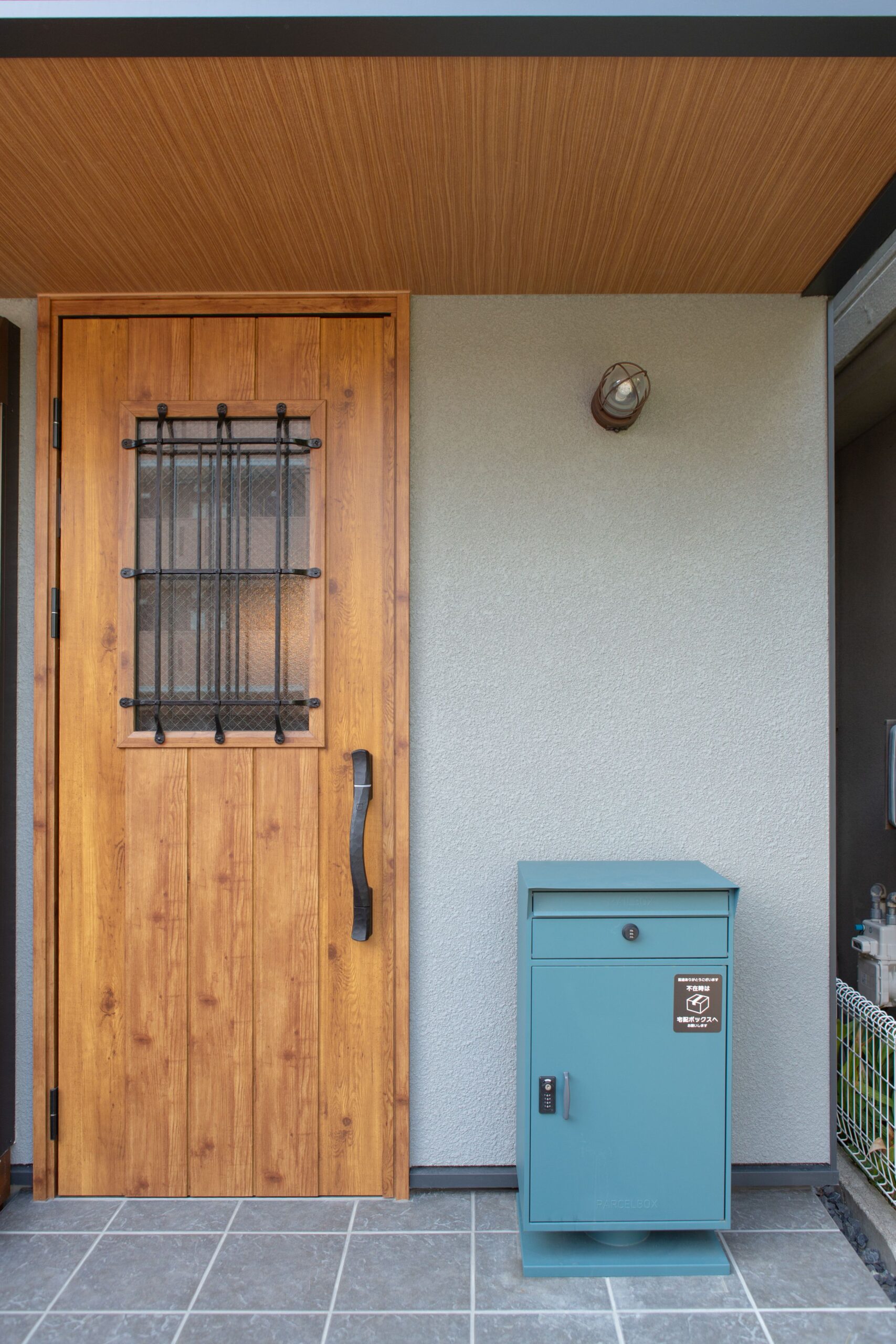 グレーを基調としたスタイリッシュな外観。玄関の扉を開けるとネイビーのガラスドアとヘリンボーンの床をポイントとしたダークでカッコイイ『ブルックリンスタイル』の空間が広がります。スタイルに統一感をもたせるよう、造作家具や電気のスイッチなど細部までこだわっています!