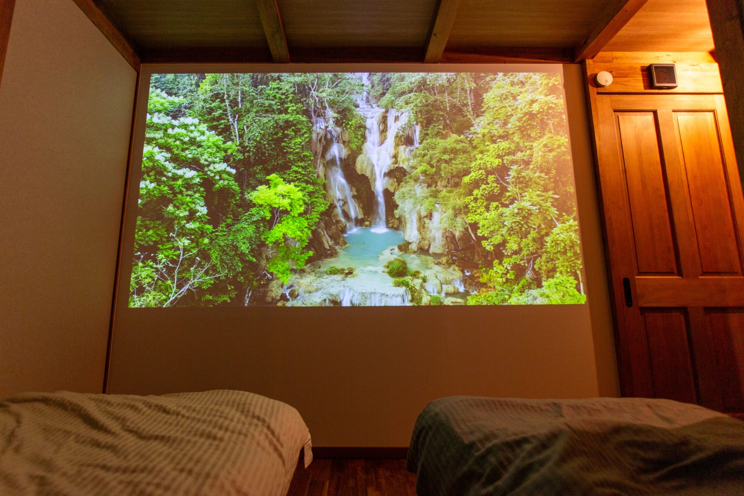 寝室にはプロジェクター照明”ポップインアラジン”を設置。お家にいながら、映画館気分で映像を楽しめます♪