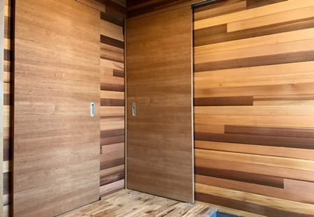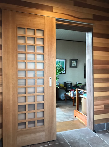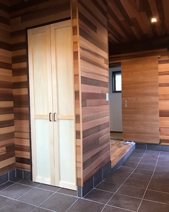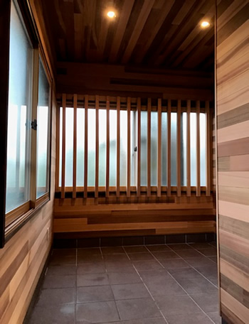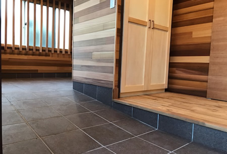 ◆ご主人様は釣りが趣味で山小屋の空間もお好きだとおっしゃっていたので、壁・天井面はすべてレッドシダー(米杉)の羽目板仕上げをご提案しました。家に帰った時になんだかホッとできる空間になったとおっしゃっていました。お母様はまだ車イスは使っていな い為、それまではこの土間スペースを釣り道具を置いたり、仕掛けを作ったりするフィッシングベースにしたいそうです。