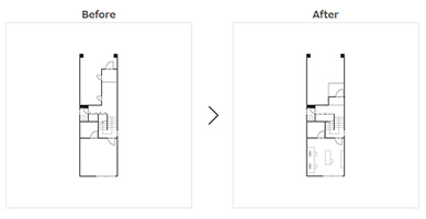 自宅で仕事をするライフスタイルに配慮し、防犯面の強化や仕事のしやすい環境づくりがよく工夫されています。車庫の拡張、柱型を隠したキッチン、デッドスペースの棚など、細やかなプランニングも光ります。