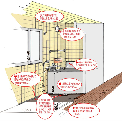 約、築50年超えのRC戸建て住宅は何度も増改築を繰り返し、もともと2階には無かった浴室を、北東1階倉庫の上に無理矢理設置してありました。タイル仕上げの浴室の下はピロティ構造の倉庫になっており、冬場は床からも壁からも直接冷気が伝わっていた。また換気扇ではなく自然給排気口がある浴室は、冬場に北風が吹くと冷気がすごく入ってくる。何度も追い炊きを繰り返し入浴をしていましたが、すぐにお湯が冷めるので、芯から温まった覚えがない… タイル仕上げの床や壁はお手入れが大変…。床や壁、排水口、入口の段差による転倒の心配。古いバランス釜の性能の問題、故障した際のメンテナンスの不可等、不安と不満が満載で今回のリモデルに至りました。